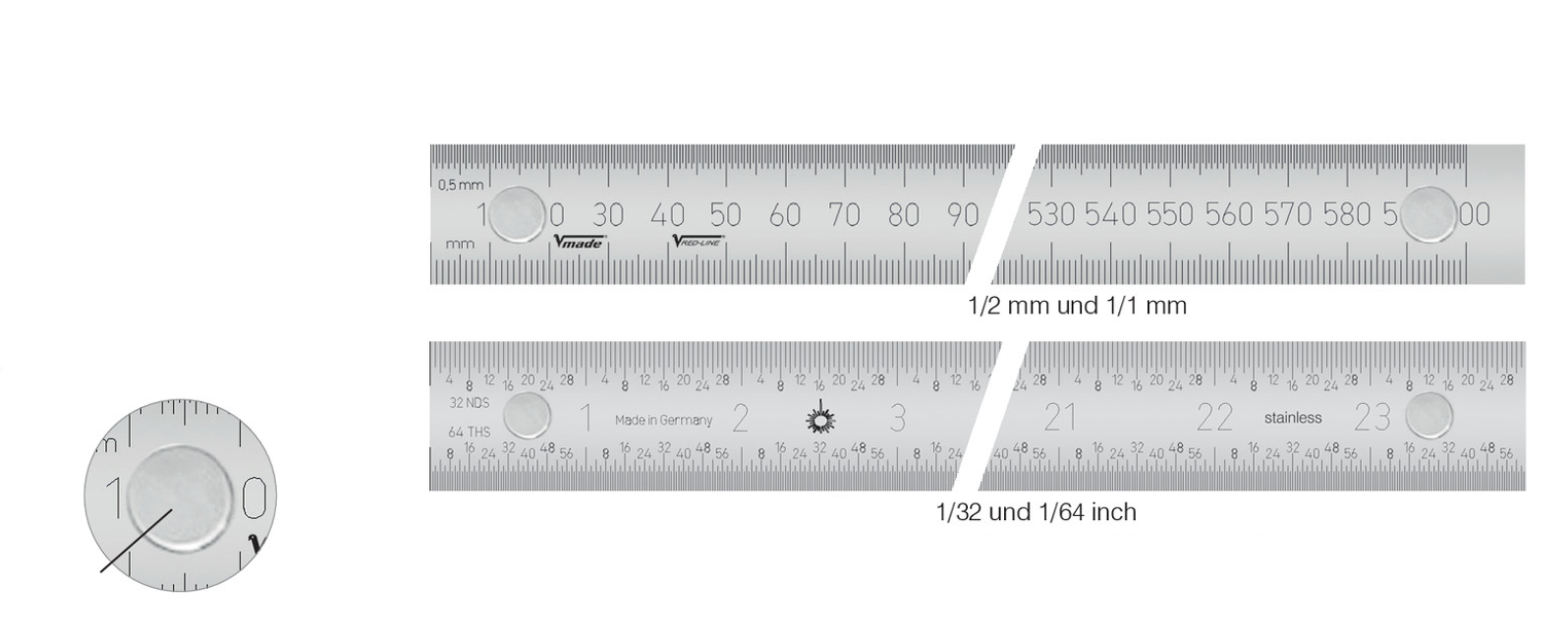 Считывание слева направо, деления с чётким считыванием, изготовлены лазерной гравировкой