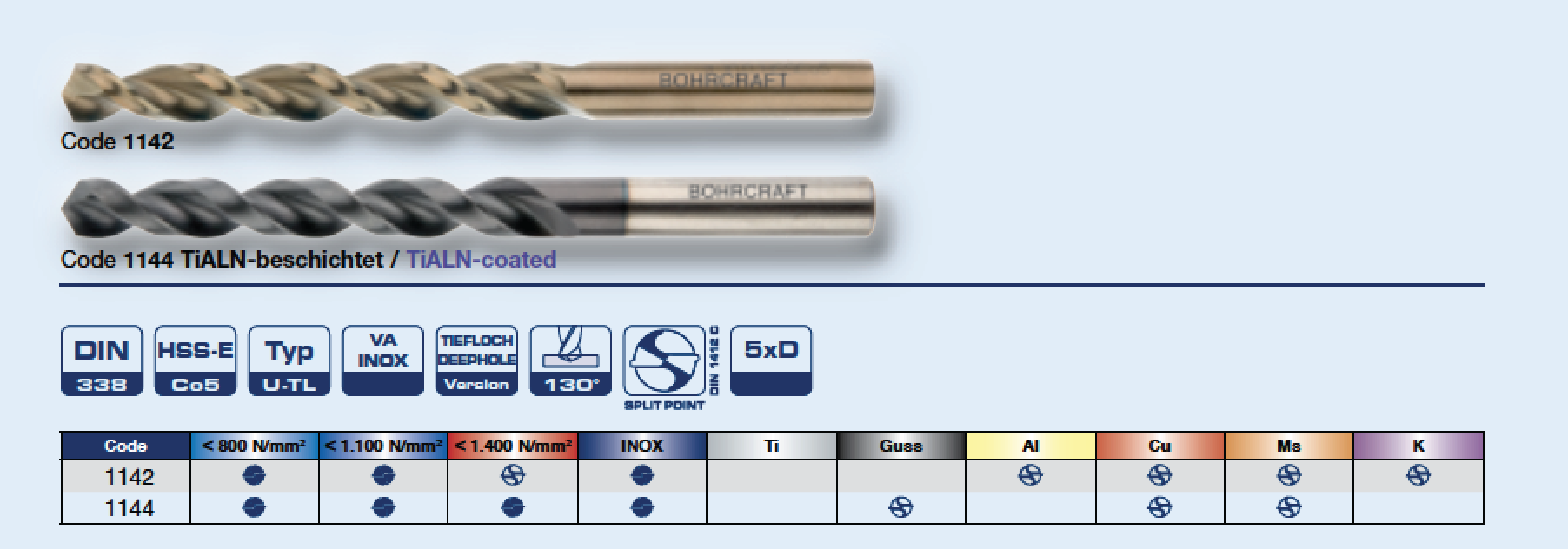 Для сверления с высокой производительностью и точностью отверстий в легированных и нелегированных сталях , титане и его сплавах, нержавеющих сталях, сталях V2A, V4A , горяче и холоднокатанных сталях, сталях с пределом прочности до 1200 н/м2